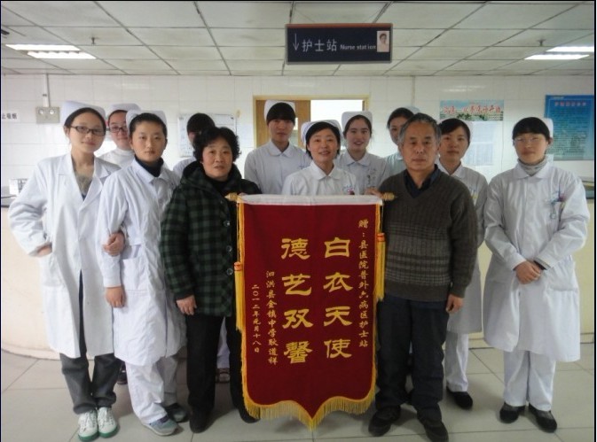 1月9日早6时许,耿某突感腹痛难忍,送泗洪县人民医院急诊,经确诊为消化道穿孔,病情十分危急,患者家属迅速将耿某转入该院六病区普外科进行手术治疗。该科当班护士热情接待了耿某,在短时间内就完善了术前准备工作,为及时抢救患者争取了时间,手术非常成功。术后,护理组人员对耿某更是认真观察、细心照顾,帮助耿某快速恢复身体。18日,患者康复出院,回家过年。但白衣天使的敬业精神和对病人负责任的态度让患者及家属感动万分,送面锦旗以表心意。