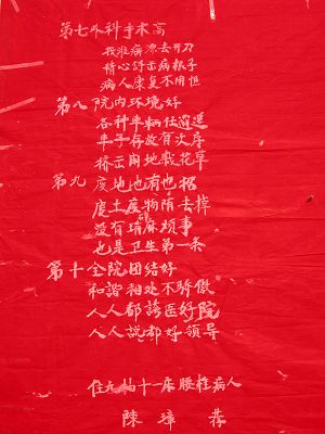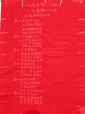昨天早晨上班的路上,离得很远就能看到医院办公楼东墙面上一片抢眼的红色,周围已经有好多人在观看,有位病人家属边看边读,旁边还有位患者家属说:“这个医院就是这样的。”