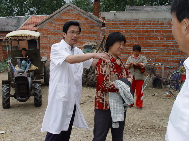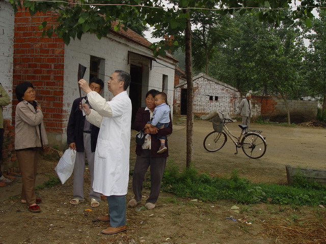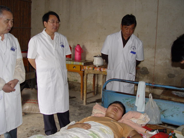 义诊小分队首站来到车门桥口时,正是细雨蒙蒙,村民们正在家中焦急等待老天放晴,这时医疗队在路边摆开了桌凳,顿时就围上来几十位男女老少。一位患脑血栓的病人,左臂弯曲,活动困难,主任医师、脑外科专家常朝乐给他耐心地讲解了康复与日常保健的知识;中西医结合,擅治疑难杂症的中医院副院长牛尚一还手把手教他做功能训练,一教就是半个小时,凉爽的天气累出满头大汗。听说是县人民医院专家下乡义诊,一位孝顺的小伙子骑摩托车从好几里之外把老母亲带来请专家诊治。