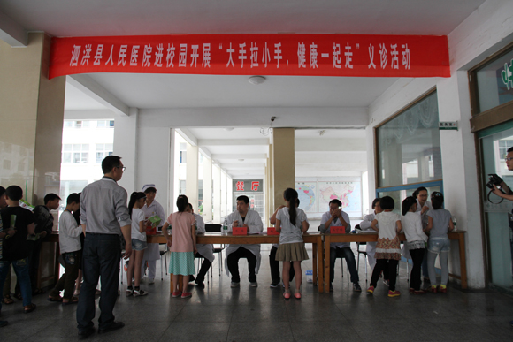 导读:“孩子们的口腔问题不是很理想”口腔科医生喻宁媛说,小学生的口腔问题大多是前牙反颌和龋齿,也就是俗称的“地盖天”和虫牙。预防这一疾病要注意口腔卫生、做定期检查,争取早发现早治疗。5月7日下午,泗洪县人民医院口腔科、眼科、五官科、儿科等科室9名白衣天使们组成医疗队伍,带着各项医疗器具走进泗洪县实验小学,开展“大手牵小手,健康一起走”义诊活动。
