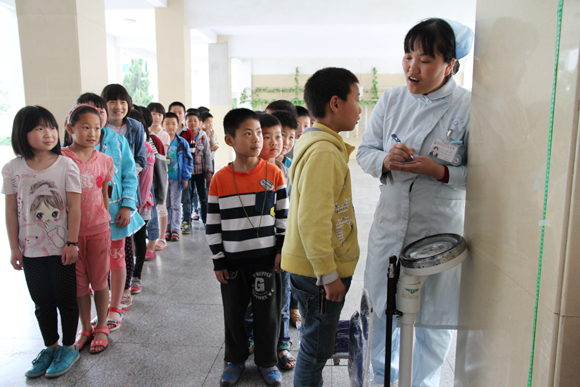 义诊现场,医生们为每个学生逐一细心地检查身体,量身高、测体重、量血压,医护人员望着孩子一张张可爱的脸,检查时候忍不住摸摸学生的头,认真的跟学生们交流、沟通,询问学生们的身心状况,并将检查信息反馈给老师。