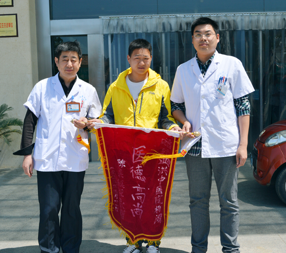 导读:5月21日上午10时左右,泗洪县中医院内,一位20多岁穿着黄色上衣的年轻人将手里拿着的一面写有“医德高尚”的锦旗递到了其父亲的主治医师杨闯和消化科主任郑国军的手中。锦旗虽轻,但是意义非同寻常。