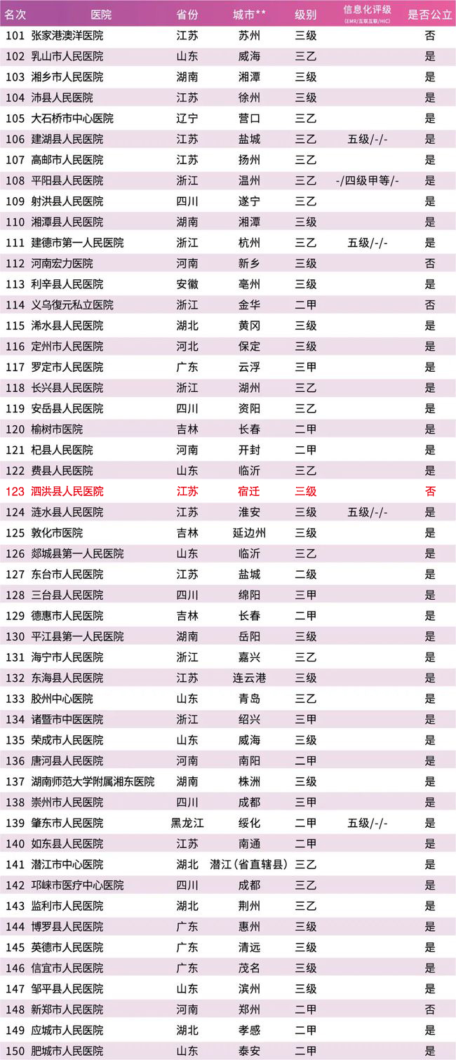 2020年县级医院300强”榜单中,泗洪县人民医院在全国6000余家县级医院评比中排123名。