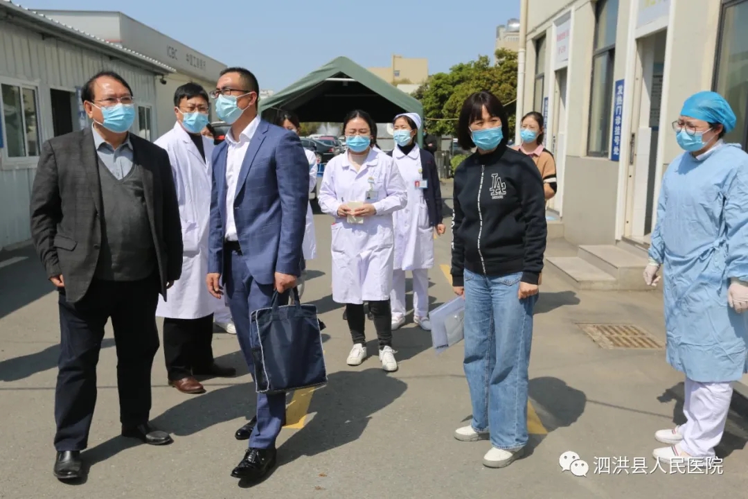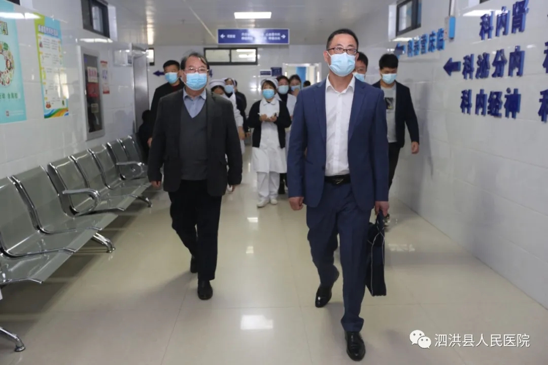 当前,疫情防控形势依然严峻,健全疫情防控体系刻不容缓。为全面做好全市医疗机构常态化疫情防控,守好疫情防控“第一关”。4月9日上午,由宿迁市钟吾医院医务科黄科长、院感科戚主任等一行组成的督导组,对我院进行常态化疫情防控暨院感管理专项督查。洪医集团副董事长、泗洪县人民医院院长高明献和副院长陈虎带领相关科室负责人陪同检查。