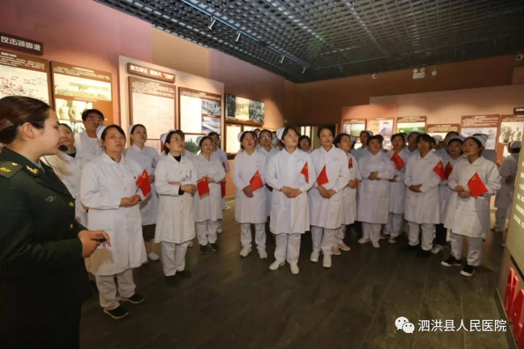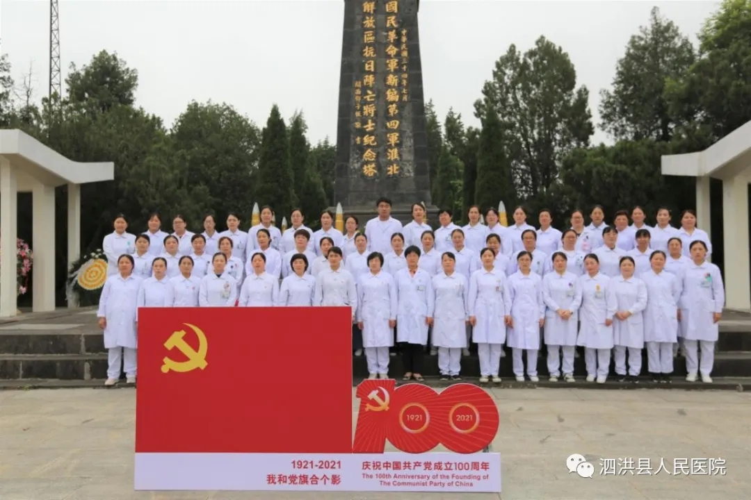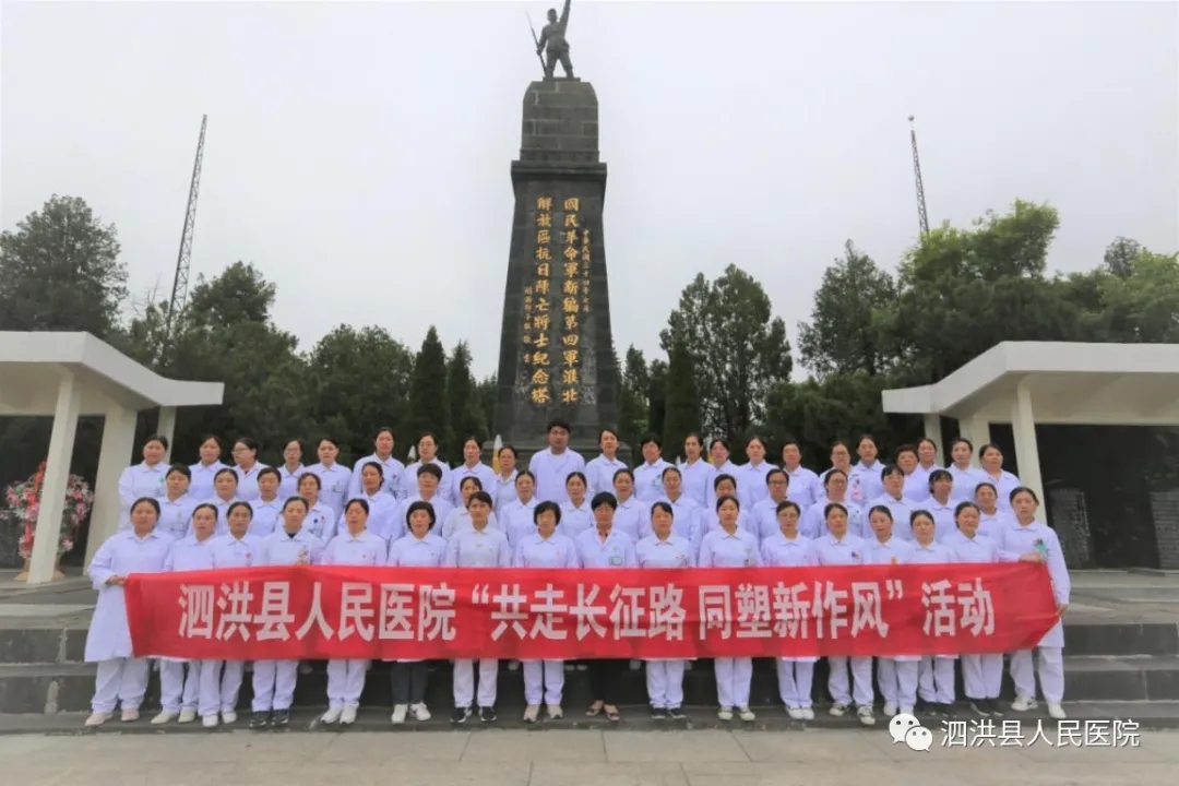 为庆祝建党100周年暨纪念5.12国际护士节2021年5月13日下午,泗洪县人民医院党委组织60余名护理中层干部、护士党员、入党积子先后到大王庄党性教育基地和雪枫陵园,开展传承红色基因,弘扬南丁格尔精神和共走长征路,同塑新作风活动,引导党员干部职工学史明理、学史增信、学史崇德、学史力行。本次活动由我院孙士梅副院长带队。
