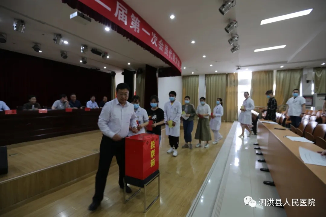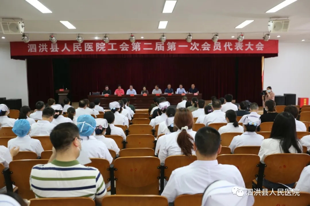 5月27日下午4点我院在综合楼6楼第一会议室召开工会第二届第一次会员代表大会。会议由副书记、副院长董红军主持,泗洪县总工会副主席王雷,洪医集团董事长高开亮,副董事长、泗洪县人民医院院长高明献等全体董事会成员、院领导班子成员出席会议,全院八个分工会 80 名工会会员代表参加了会议。