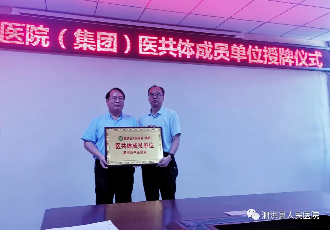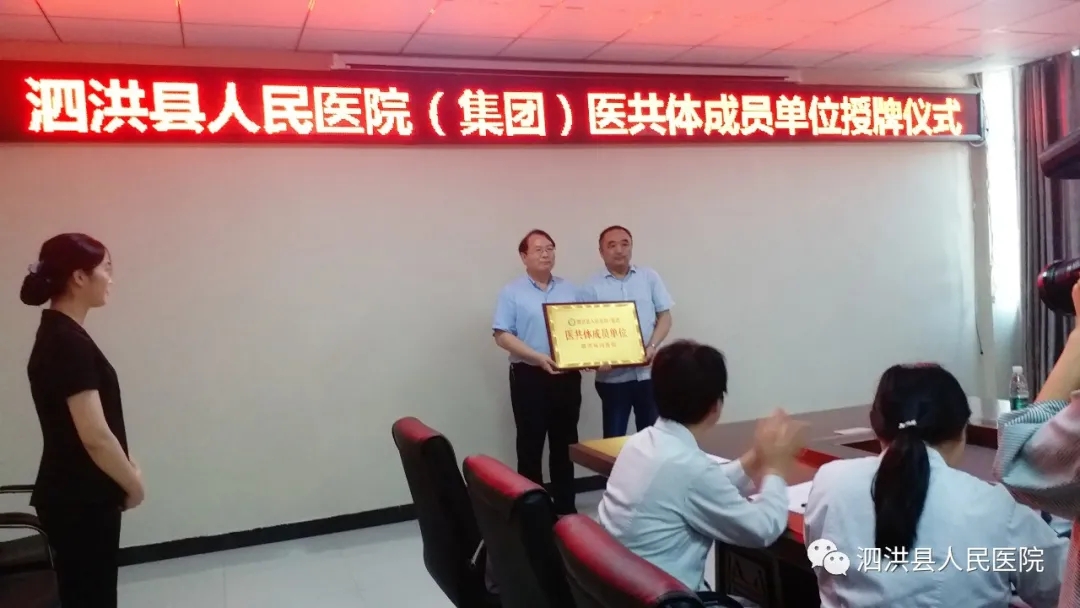 7月9日,泗洪县人民医院(集团)紧密型医共体成员单位授牌仪式在我院举行,洪医集团副董事长、泗洪县人民医院院长高明献,泗洪县人民医院副院长、泗洪中医医院院长陈鹏,泗洪中医院副院长胡奋强,泗洪双沟医院副院长汤仁涛和泗洪县人民医院医务科副科长、洪医集团洪泽湖农场门诊部的主管主任惠玉及各院区行政管理层20余名中层干部出席了本次仪式。
